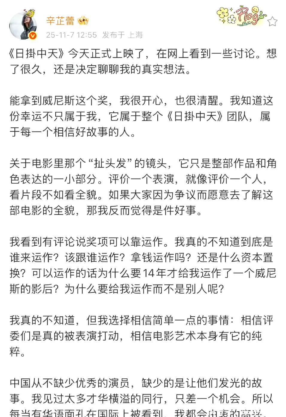 但辛芷蕾呢,没在怕的。她没选同样私密的地方回嘴,而是直接在微博这个大众广场上,把话摊开说了:你别拿一个镜头说事:电影是演一个完整的人,你单拎出“扯头发”来否定我全部演技,这不讲道理。要能运作早运作了:我等这个奖等了14年,要真能靠关系,这奖为啥不早点给我,或者给别人?我替所有好演员说话:中国不缺好演员,就缺机会。这话一说,就把她自己的委屈,变成了替整个行业里没机会的人发声。你看,这么一来一回,两个人的私怨,就变成了关于“公平不公平”的公共话题了。